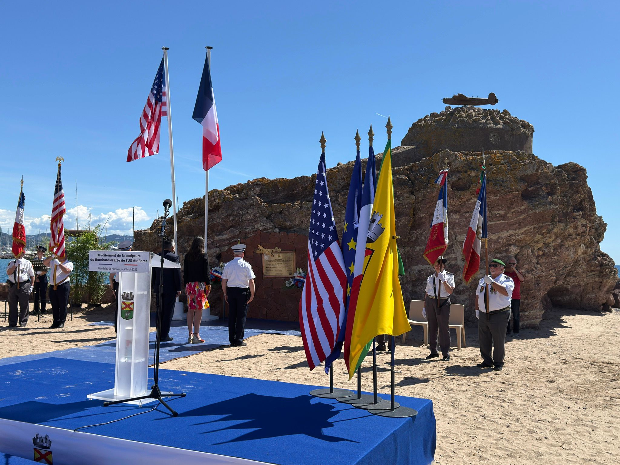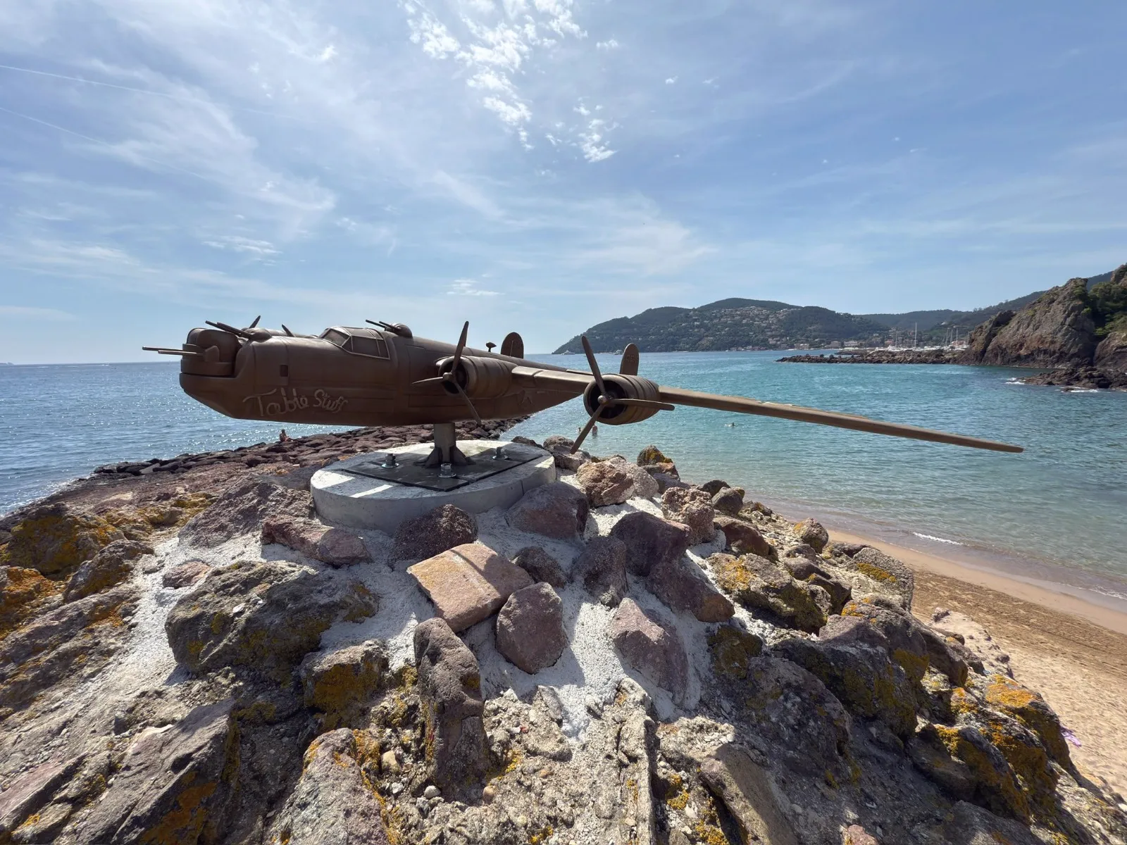 Œuvre commémorative en bronze dédiée au bombardier B24H et à son équipage, tombés en mer au large de la baie de La Napoule en mai 1944. Un hommage historique alliant devoir de mémoire et précision technique.