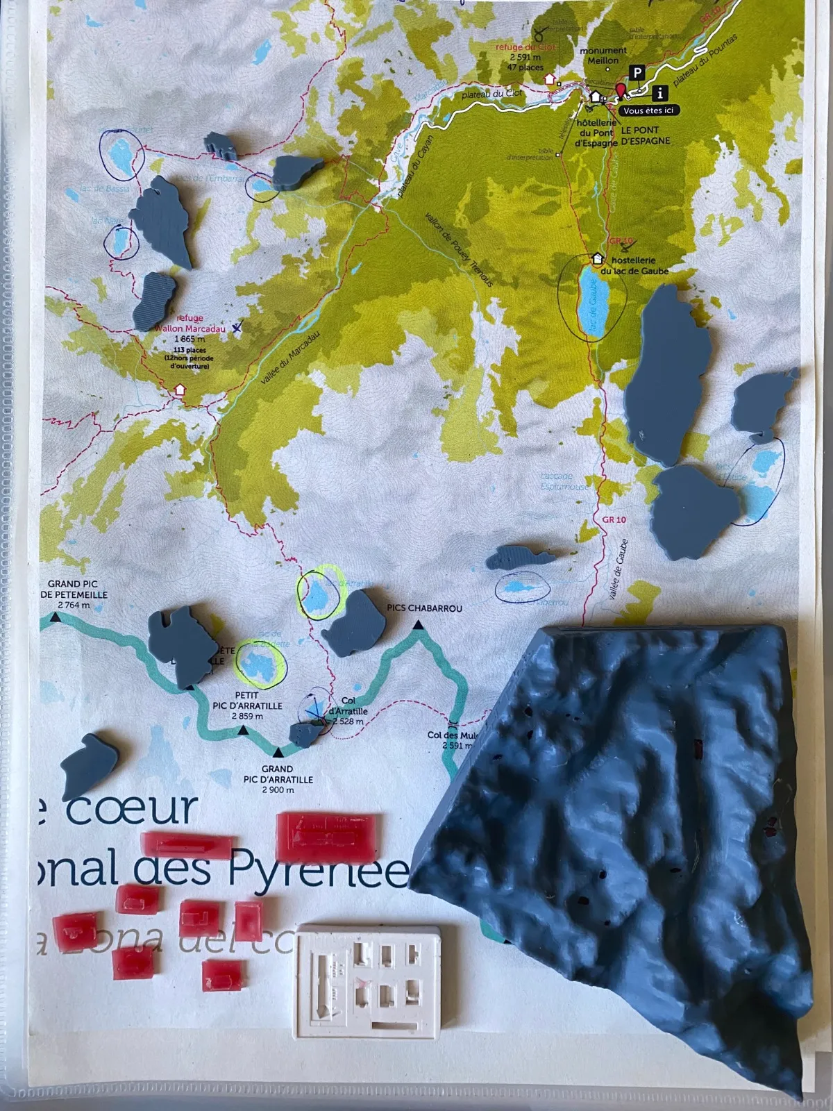 • Détail : Impression 3D haute définition des reliefs, lacs, refuges et espaces d’accueil.